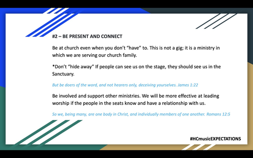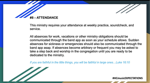 Expectation #2 is not about attendance, although that one is coming. This expectation is about not being a music snob. Supporting other ministries and building relationships with our church family, not only will help you and your spiritual walk, but it will help strengthen this ministry. Remember we are LIVING PROOF!