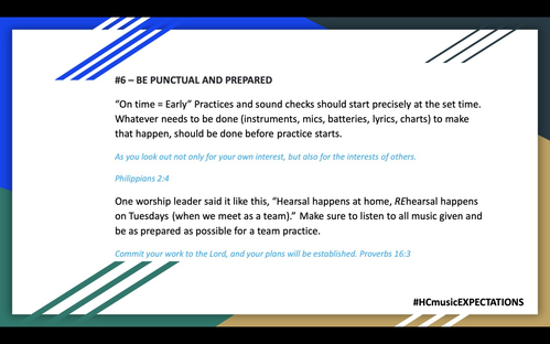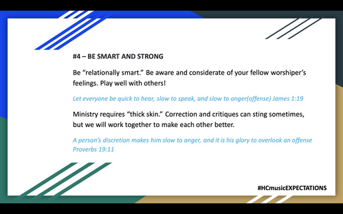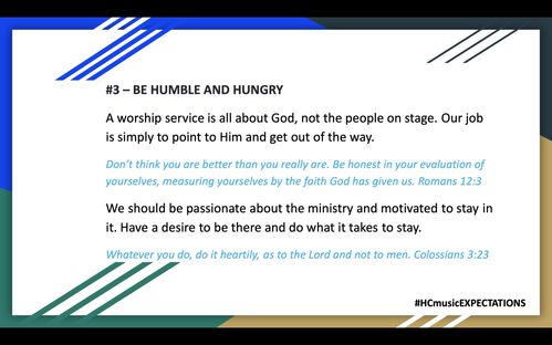 Expectation #3 sounds a little like #2, it must be important not to be a music snob. We are not divas or pop-stars, we are SERVANTS. Desire to be a servant with a spirit of excellence! Straight Talk: If you get upset if you are not on the front row, you need to be on the back row. If you get salty when asked to share your mic or solo with another person, you should not have either.
